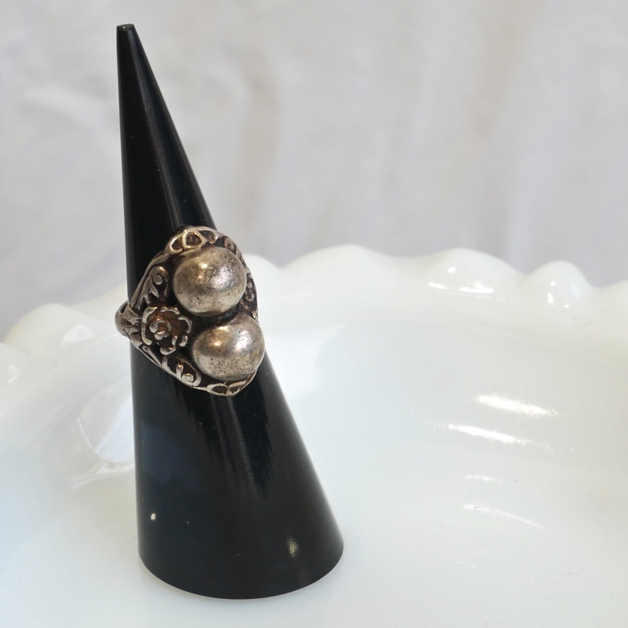 2つの球体のデザインが印象的なシルバーリング。