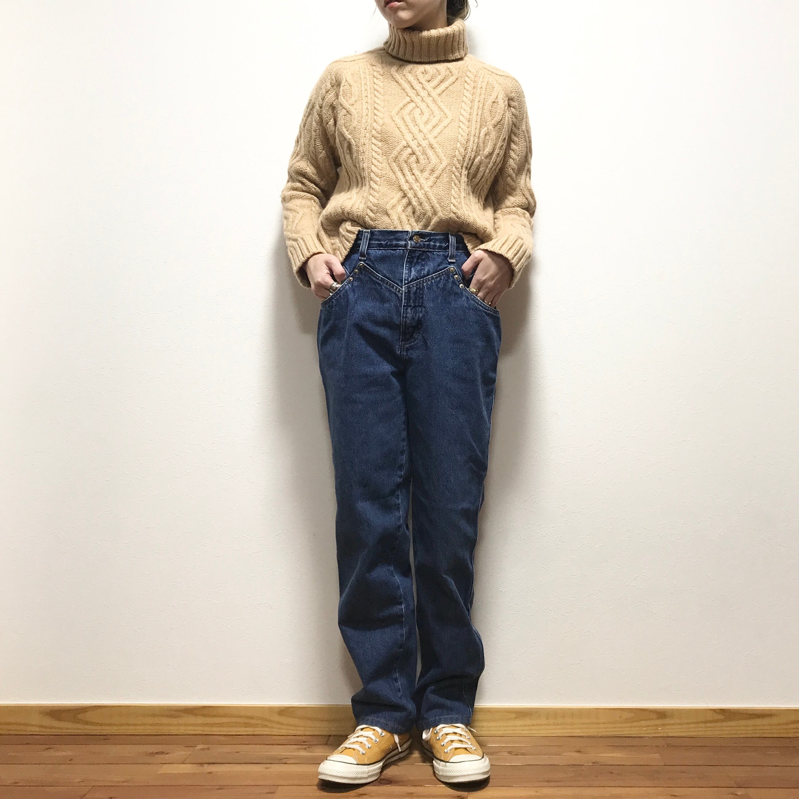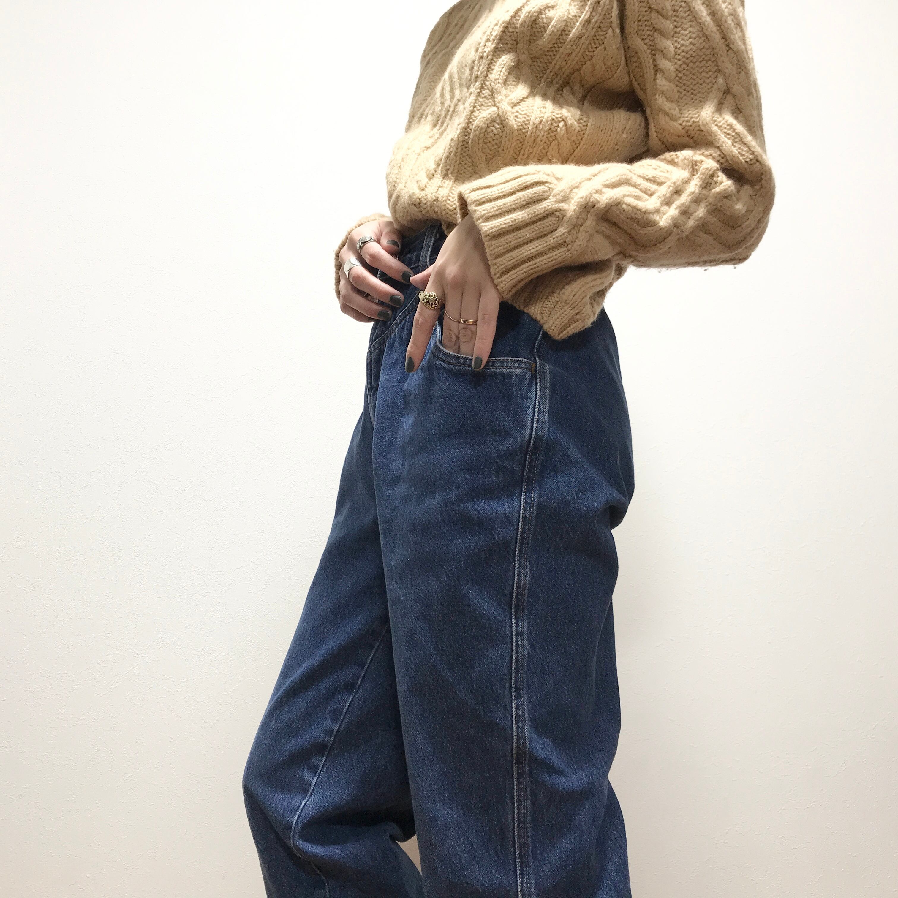 リベット使いが面白いデニムテーパードパンツ。股上が深くとてもキレイなシルエットです。