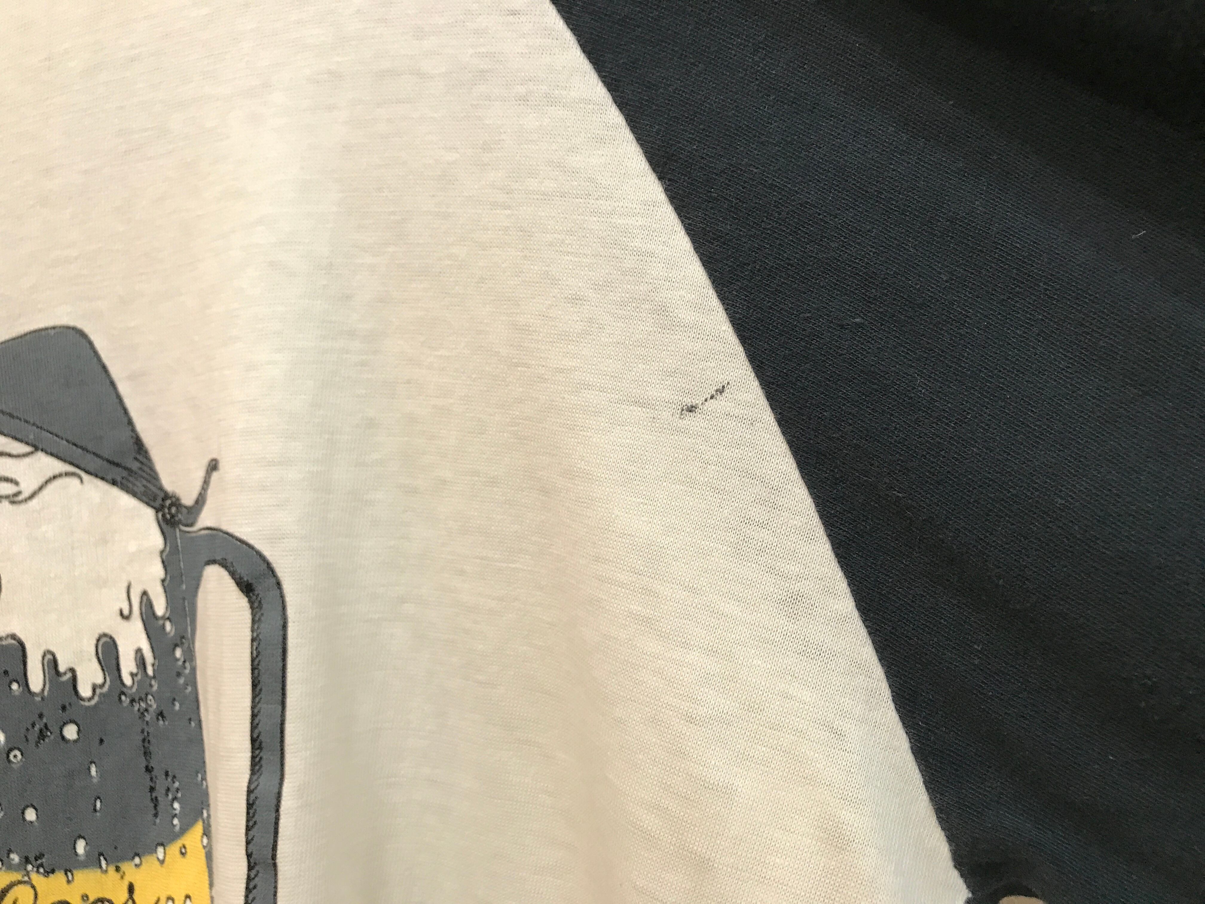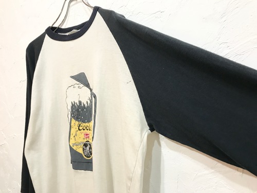 ビール好きにはたまらない70年代のCoorsラグランTシャツ。この年代には珍しい黒袖。わざと加工したようなダメージ具合がかっこいい一着です。