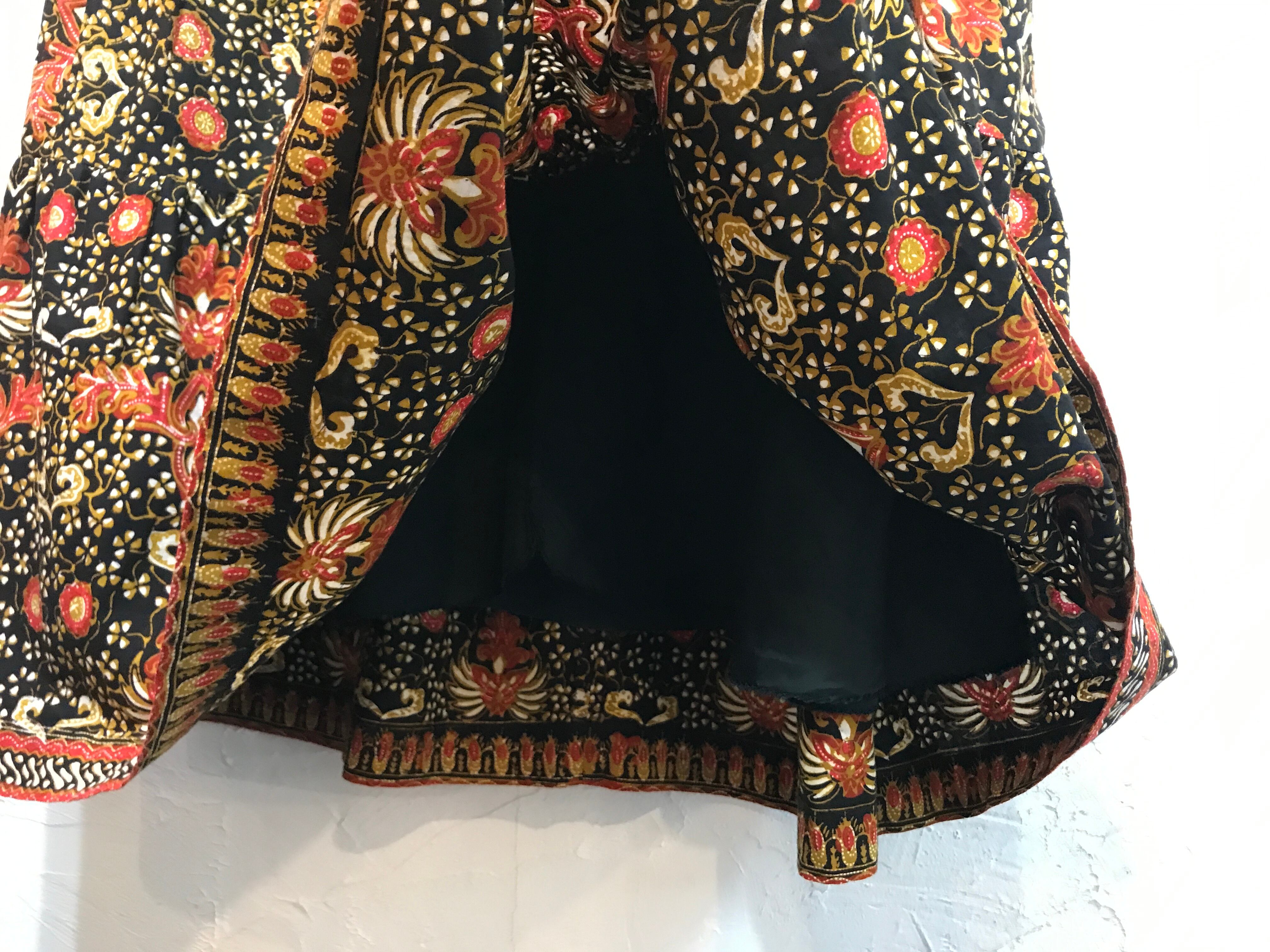 70年代の裾ティアードスカート。黒地に赤やオレンジの暖色系のエスニック柄がとても素敵でヴィンテージ感溢れる1着。丈が長くシルエットも最高です。